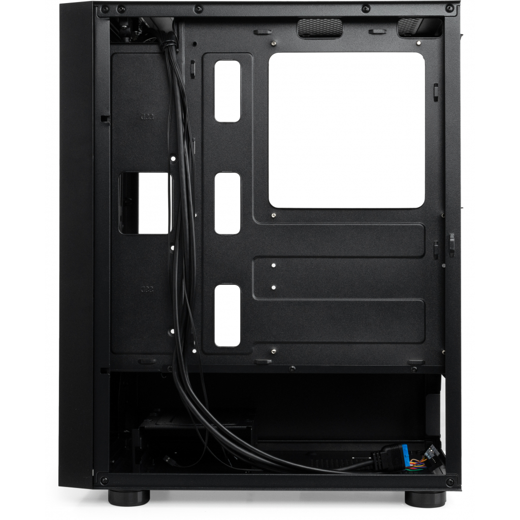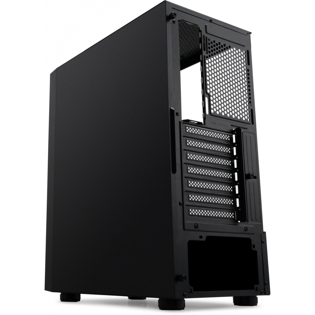 Геймерский корпус типоразмера Midi Tower имеет вертикальную установку, блок питания не предусмотрен в комплекте. Корпус имеет 5 внутренних отсека для расширения размерами от 2.5 дюймов до 3.5 дюймов. Также имеется 7 слотов расширения. Охлаждение производится с помощью 6 вентиляторов (в комплект не входят), каждый – диаметром 12 см. Для удобства на корпусе имеется четыре разъёма, два USB 2.0, один USB 3.0, вход для наушников и микрофона.